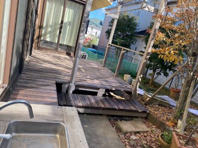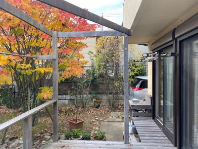 9年前にパーゴラとウッドデッキを造ったお宅のメンテナンスです。パーゴラはハードウッドなので大丈夫なのですが、デッキ床板はお客様の希望で三重県の杉板をとりよせましたが杉はやっぱり塗装をした方がよいですね。