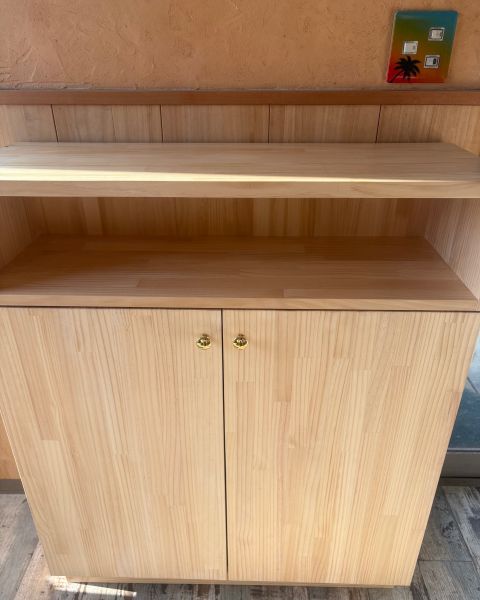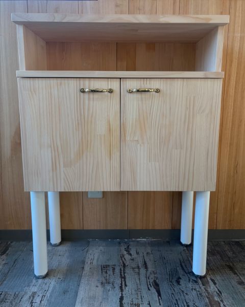 パイン集成材のクリアー塗装、上部オープンボックス下部カウンター収納、扉はクリスタルのツマミです。リモコンやスイッチをよけるのも自由自在。