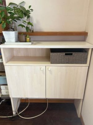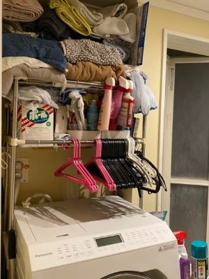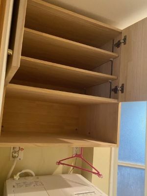 洗濯機上の金属ラックにあふれていたタオルや洗剤を収納すすための吊戸棚、両側の壁の間のぴったり納めました。