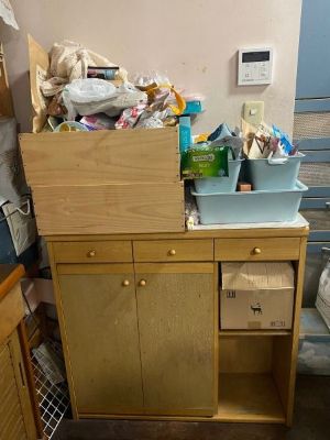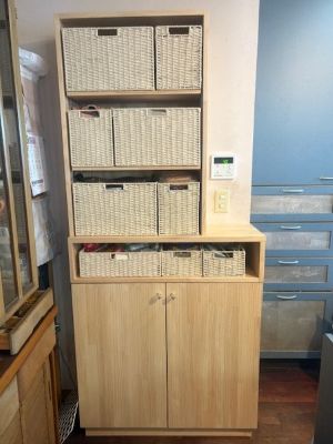 左の食器棚と右のキッチン収納に挟まれた壁に溢れかえっていたストック食品などのオープン%カウンター収納を設置、リモコンとスイッチもよけて造ってます。