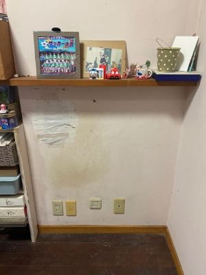 上は対面カウンターの棚板、左の棚と右の壁にもピッタリと挟まれた場所にカウンター収納を設置。下のコンセントとガス暖房機のホースなともよけて造ってます。