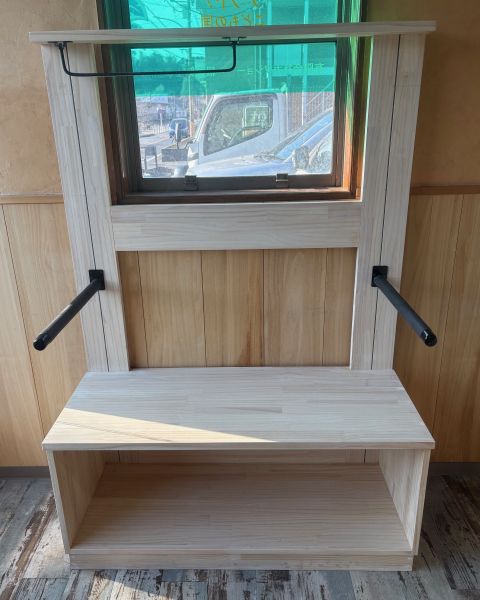 お住まいのインテリアにもマッチさせながら、大好きな海やビーチを思わせるようなカラーにもオーダーできます。窓の形などに合わせて高さ、巾、奥行も1cm毎にセミオーダーできる収納家具。ラックはお好みのブランドの形のものを自由自在に取り付け可能で、リーシュなども掛けられるアイアンバーも製作できます。