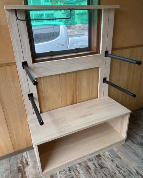 2段ラックオン。リーシュやタッパなど掛けられるアイアンバーの製作寸法も自由自在です。