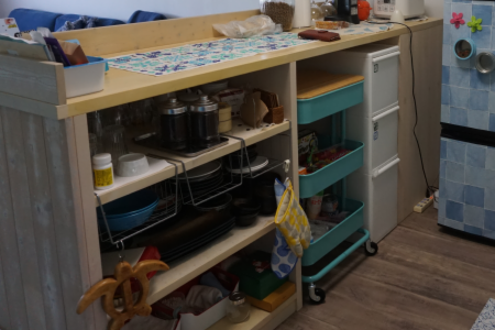 キッチン側は収納量と使いやすさを考えてオープン棚とワゴンを組み合わせてます。