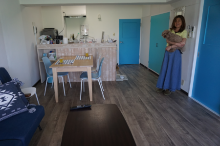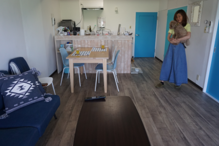 大好きなターコイズブルーとエメラルドグリーン、そこに木の温もりとシックな床を組み合わせてビーチナチュラルスタイルでくつろげるリビングに。