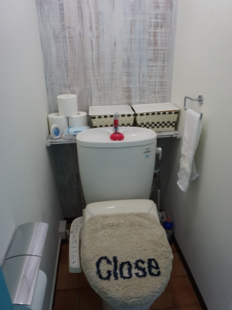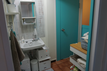 洗面器と鏡は古いものをそのまま使ったのがアンティークっぽい雰囲気に。ドアも古いものをペイントして。