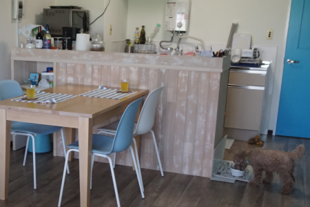 キッチンカウンターは無垢の木にダメージ加工を施したオリジナル家具。