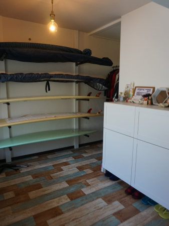 玄関ドアを開けると、お気に入りのサーフボードを壁面ラックに置けるエントランス。
